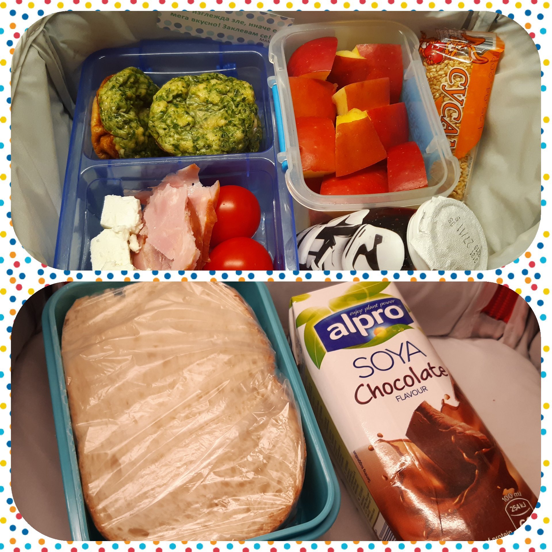 Днес е скромно - сандвич с пастет, мандарина, ябълка и 2бр нещо като луканкови пръчици, но имат обяд в училище и това е за закуска по някое време.