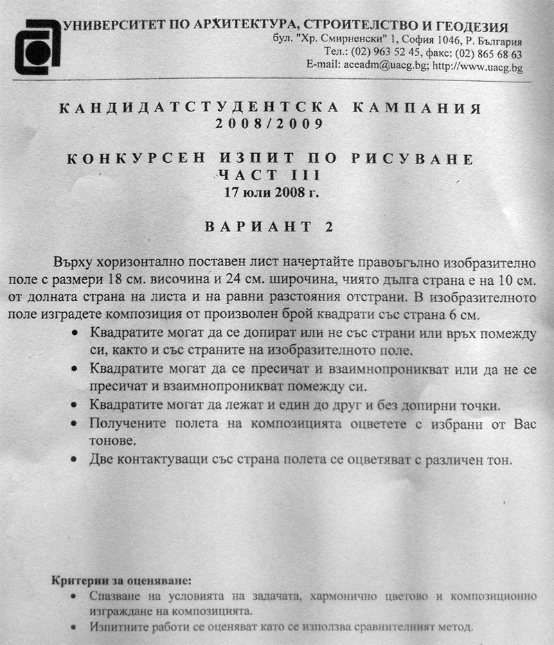 Качвам и едно условие, което открих, за кандидатстване в УАСГ - Архитектура. Да добиете представа как се поднася задачата.