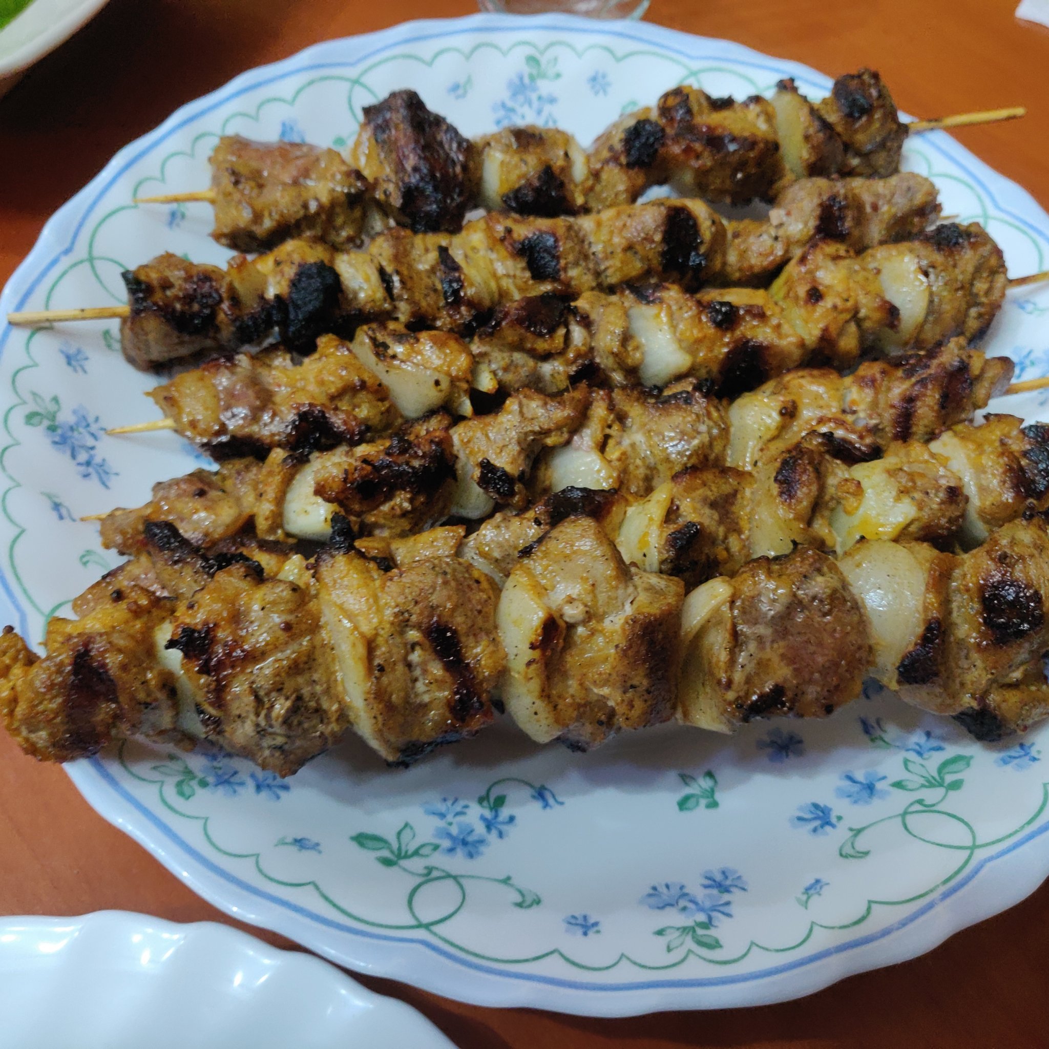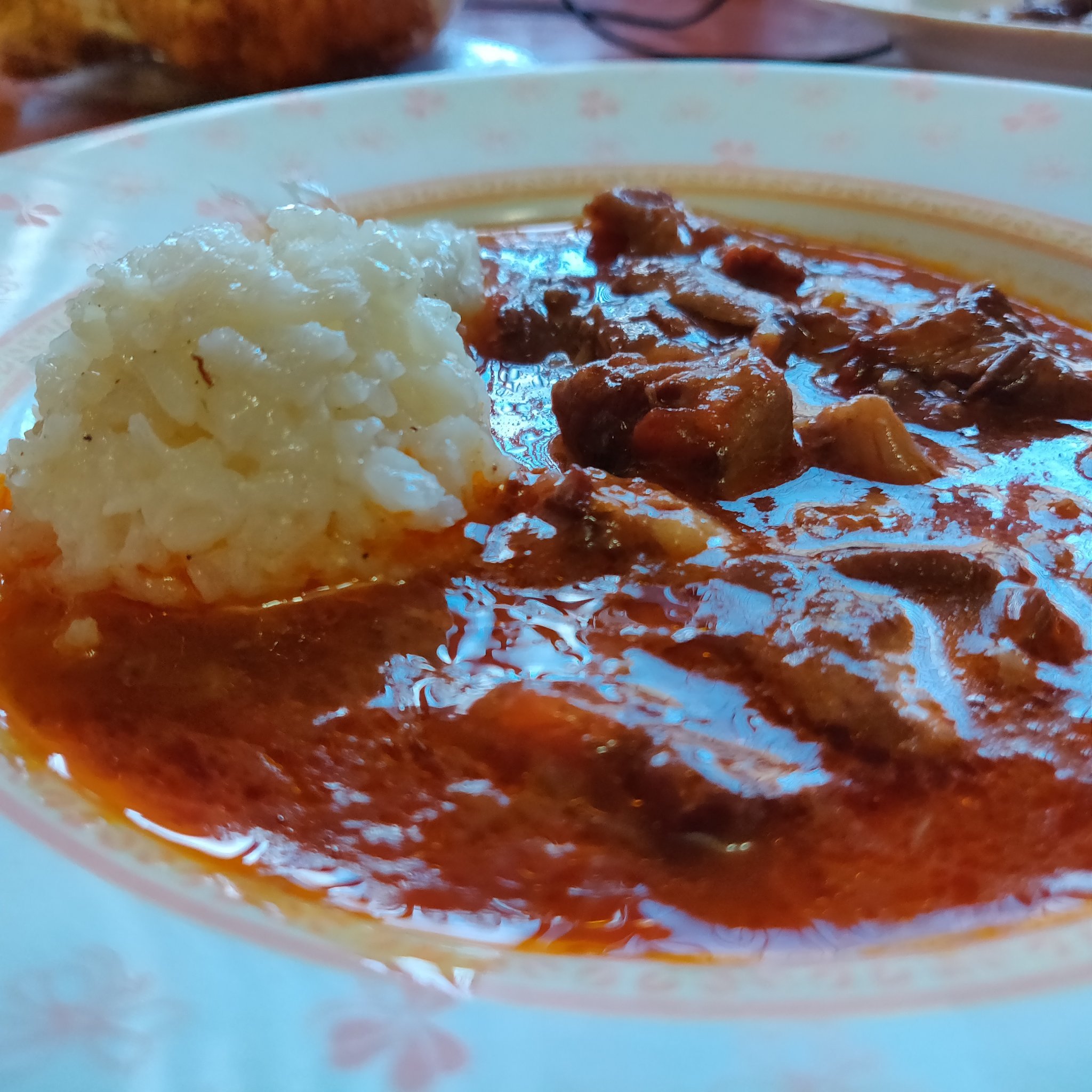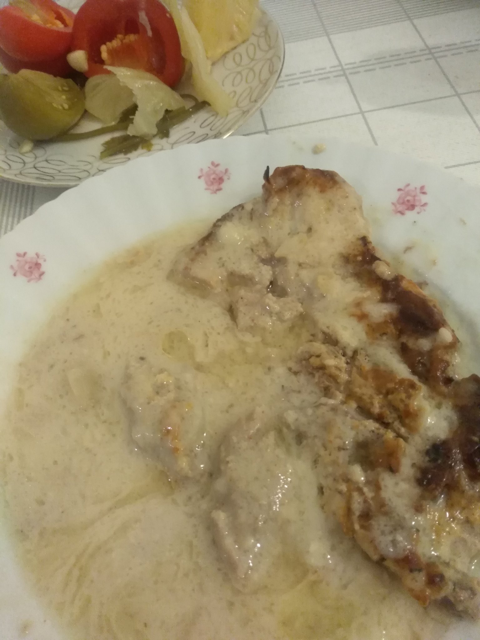 Полуизядена пържола  с млечен сос на фурна и туршийка от миналата година.