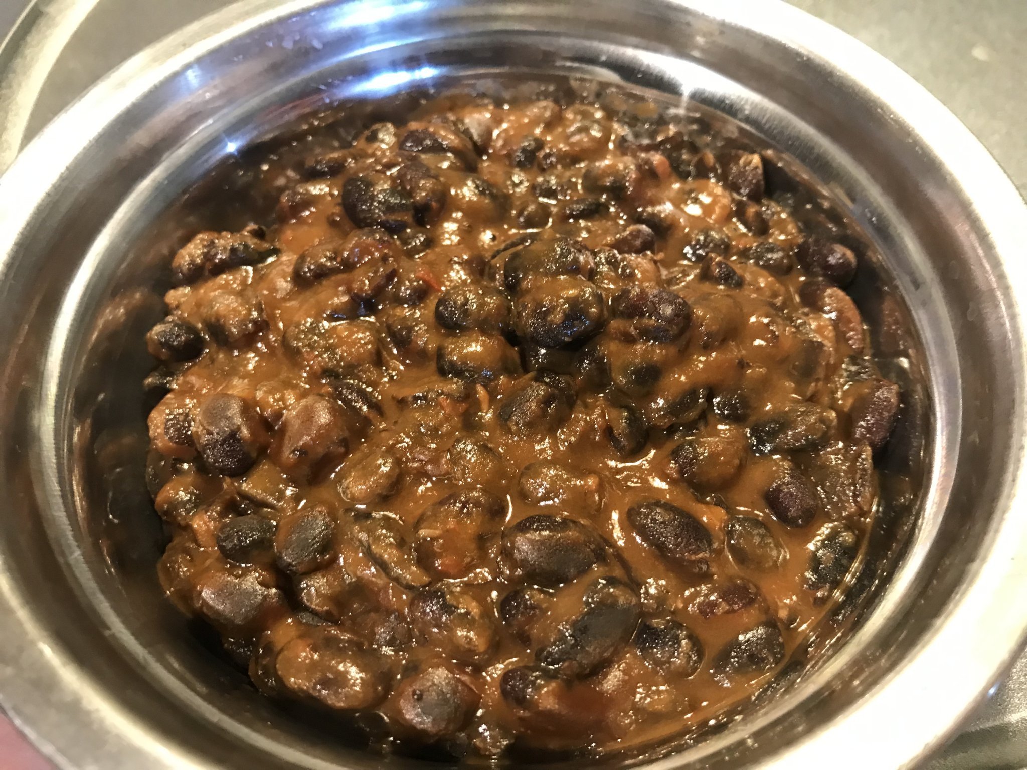 Черен боб на гъста яхния с много зеленчуци вътре.