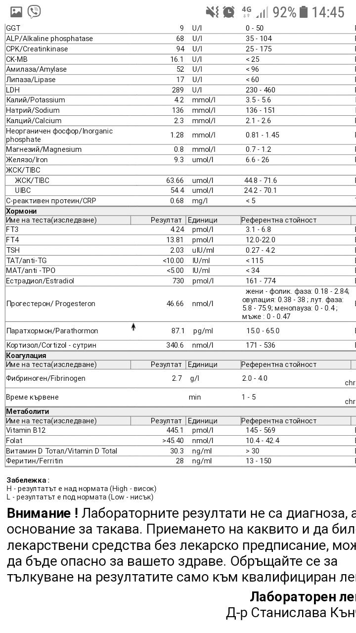 Денис, здравей отново.Мерси да помощта с цинка и медта.  Моля те пак за помощ с изследванията. Вит.д не се покачва много. Пия по 2000ед. на ден. Тестостеронът леко се е качил, това значи ли,че е с тенденция да се повишава и занапред? Желязото май ми е ниско пак. Качвам и миналите изследвания и сегашните.  Този цикъл беше много  обилен първите дни,но на 4 ден вече е доста по- слаб. Иначе е по 7. Може ли да е защото андрогените и Е. се покачват?