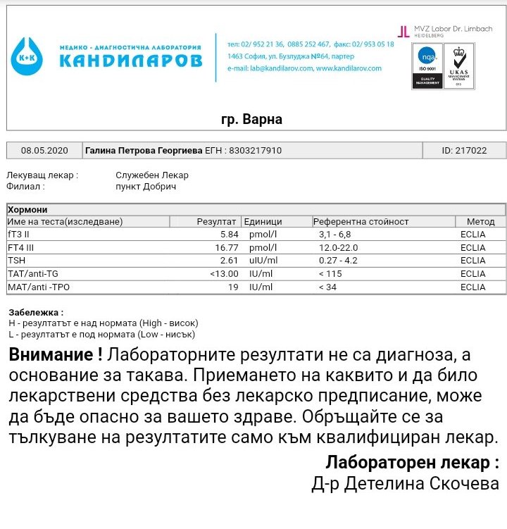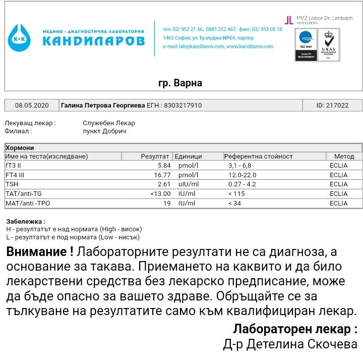 моля за мнение и за моите изследвания, тъй като съм много объркана и не знам как да ги тълкувам, а скоро на ендокринолог не се очертава да отида. Това са резултите от 3 изследвания, правени в рамките на 3 месеца. Очевидно, че нещо рязко се е променило, но не мога да разбера, дали е към добро (предвид повишените до оптимални стойности щитовидни хормони и чувствително намалените антитела ТАТ и МАТ) или към лошо ( покачилият се доста ТСХ). Такива хормони Т3 и Т4 не съм имала никога, откакто си ги меря периодично, не много често през последните 10 години). По-скоро са били като от първото изследване от 30.01.2020. Денис, ти ми изтълкува хормоните от преди 3 месеца, а какво мислиш сега? Не пия хормон.