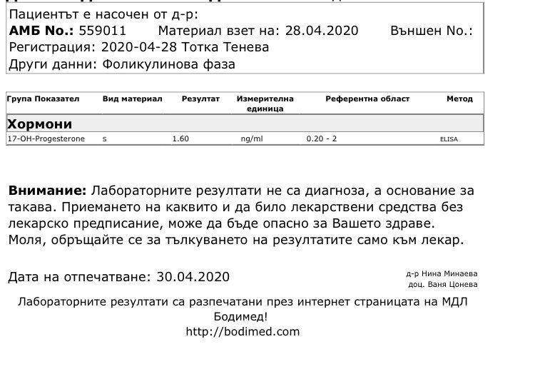 Denis, може ли коментар на новите ми резултати. 17-OH прогестерон е пуснат на 4ти ден от МЦ, но първия ден ми дойде по- късно през деня. Знам, че той леко се завишава след 3ти ден нататък.