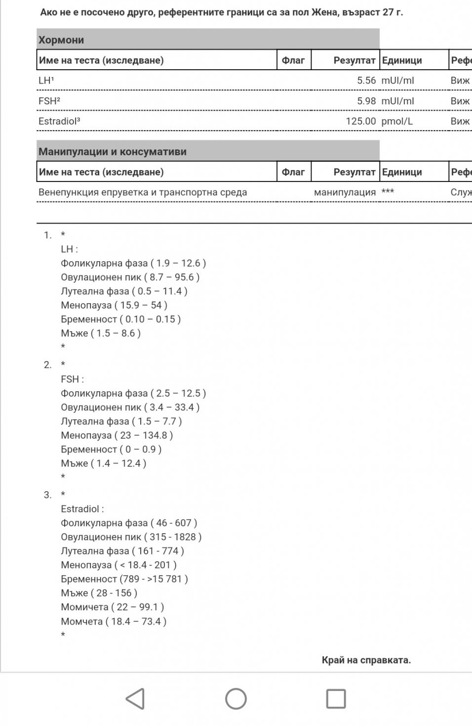 3. Референтни граници на Естрадиол ( Estradiol ) за жени в репродуктивна възраст по фази в pmol/L:фоликулна 45.4-854;