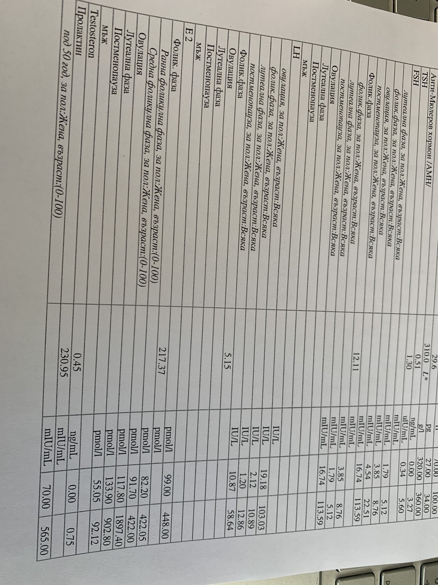 Пролактин/Prolactin       579       mIU/l     ЖЕНИ: 40-530; МЪЖЕ: 53-360; при бременност се увеличава до 10х от изходната стойност