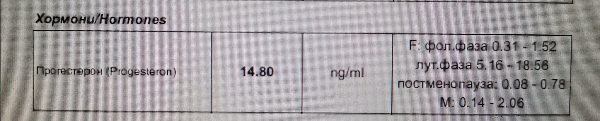 Прогестерона излезе 21,770 ng/ml при стойности на лабораторията 1,83 - 24.