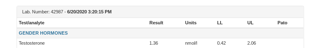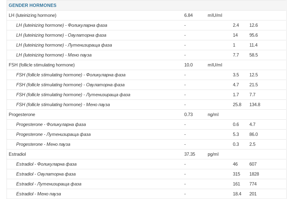 Прогестерон/Progesteronе       7.340       nmol/L     M<0.159-0.474; фол.ф. 0.181 - 2.84;ов.ф. 0.385 - 38.1; лут.ф.5.82 - 75.9;постменопауза:<0.159 - 0.401
