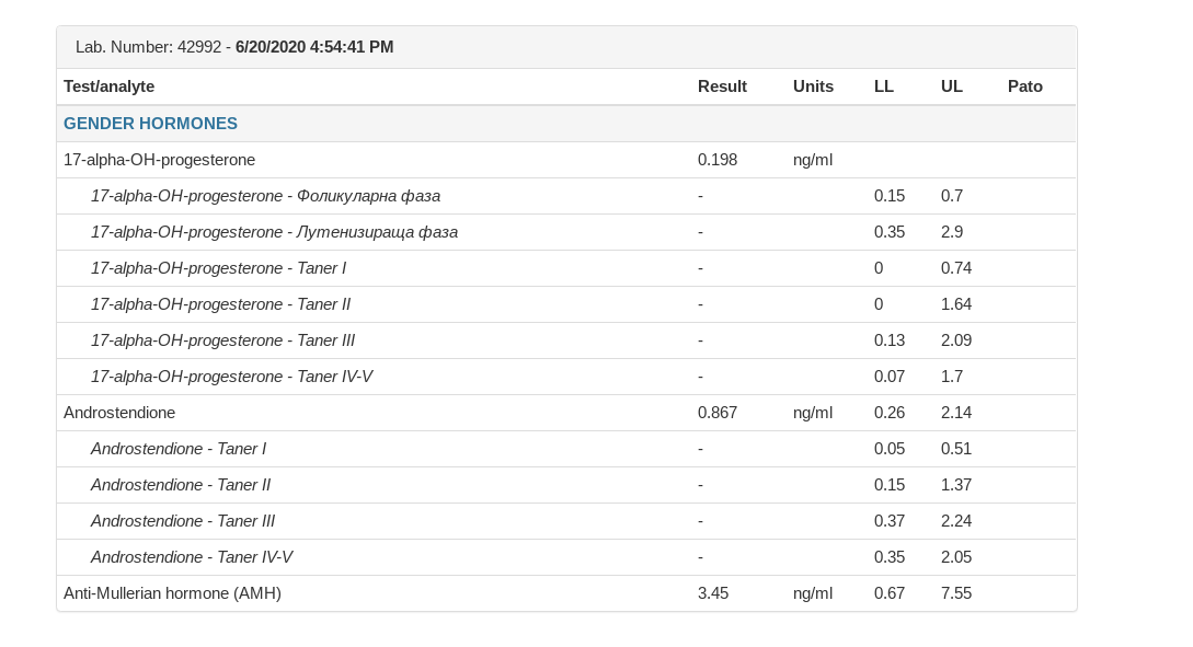 Прогестерон/Progesteronе       7.340       nmol/L     M<0.159-0.474; фол.ф. 0.181 - 2.84;ов.ф. 0.385 - 38.1; лут.ф.5.82 - 75.9;постменопауза:<0.159 - 0.401