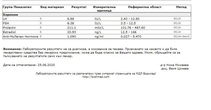 Здравейте! Някой може ли да разчете тези изследвания? Правени са на 5ти ден от месечния ми цикъл. На 28 години съм и правим опити за бебе от около 7 месеца. Диагностицираха ме с поликистозни яйчници (само десният имал малки кистички) а преди това друг доктор каза, че имам ендометриозна киста за операция.. Единственото оплакване ми е, че не мога да забременея през всички тези месеци. Имам си редовен цикъл, с нормално неразположение - никакви силни болки, силно течение и тн. Четох за симпотми спрямо яйчници, хормони - нямам никакви, чувствам се добре, слабичка съм си цял живот, нямам проблеми с наднормено тегло и тн..с изключение на стреса от цялата ситуация..