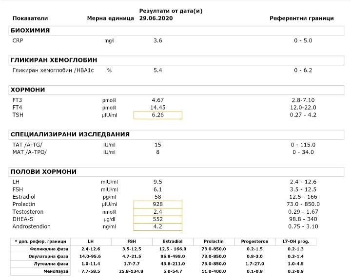 Всички други показатели са добре. Стремя се да се храня здравословно и да спортувам, въпреки, че сега е по-трудно, заради хиперфункция на ЩЗ (TSH 0, FT3 над норма). Нямам нарушения на Месечния цикъл.