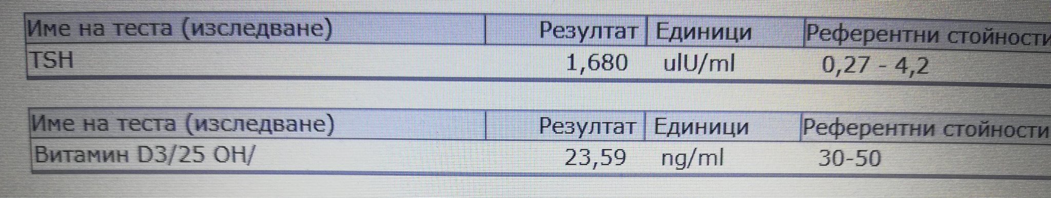 Здравей Денис! Може ли да си кажеш мнението относно резултатите от ЩХ направени 3 седмици след като съм спряла да кърмя. Антителата не съм ги изследвала, понеже всеки път са 0(нула) или почти близки до нулата. До сега съм имала 2 цикъла след раждането. По време на бременността бях на терапия с Л-тироксин, който коригирахме, когато започне да се качва над 2. След като родих спрях приемат му. Благодаря предварително!