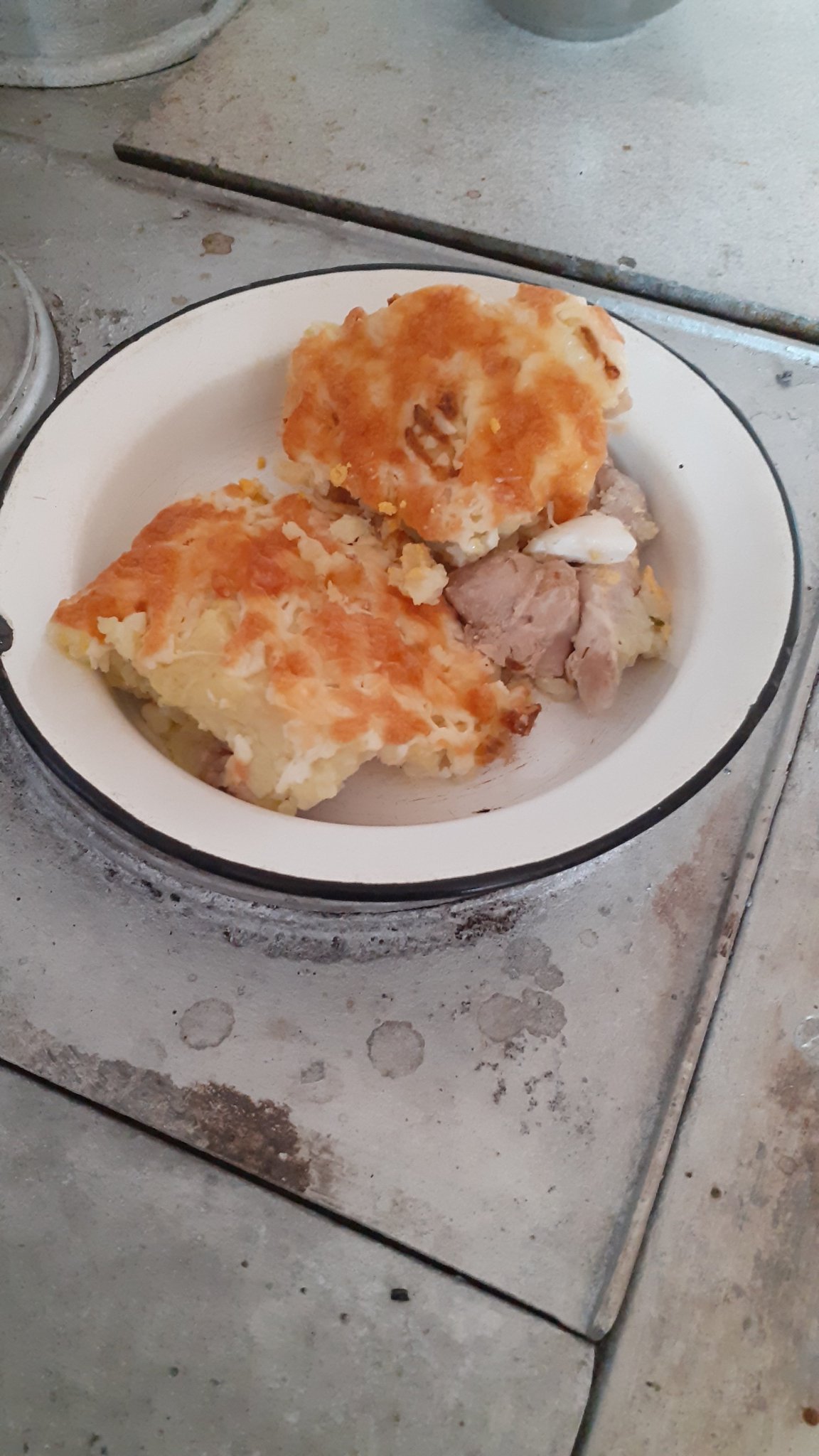 Картофите ги сваряваме и смачкваме на картофено пюре .На дъното на тавичката слагаме олио ,за да не можем дъното на тавичката .Редим пласт картофи,след него нарязване пил.месо на кубчета,с нарязаните краставички и яйца правим втори пласт като ги редуване и отгоре свършваме с картофи върху тях рендосване кашкавал и запичаме до готовност.