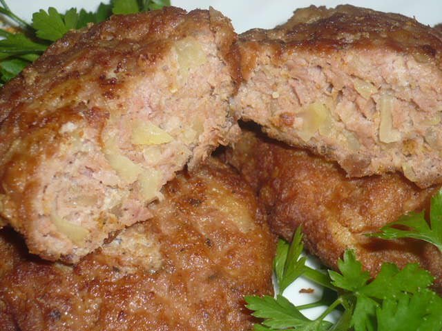 Картофа се настъргва и всичко се разбърква. Гребе се с голяма лъжица и се пържат шницели в сгорещена мазнина.