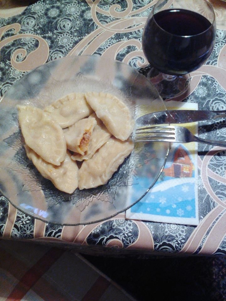 Разточвам тънко, изрязвам пелмените слагам от плънката намокрям едната половина и ги затварям.
