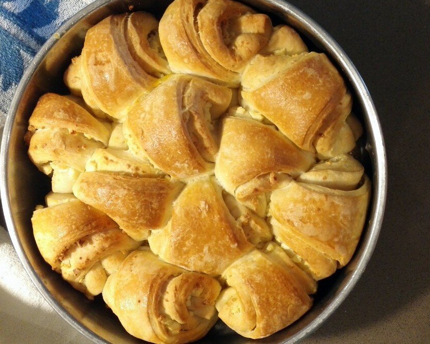 Разделям тестото на 2 топки, които разточвам. Върху едното натрошавам сиренето и върху него слагам другото разточено парче. След това парчетата се режат на триъгълници, които се навиват.