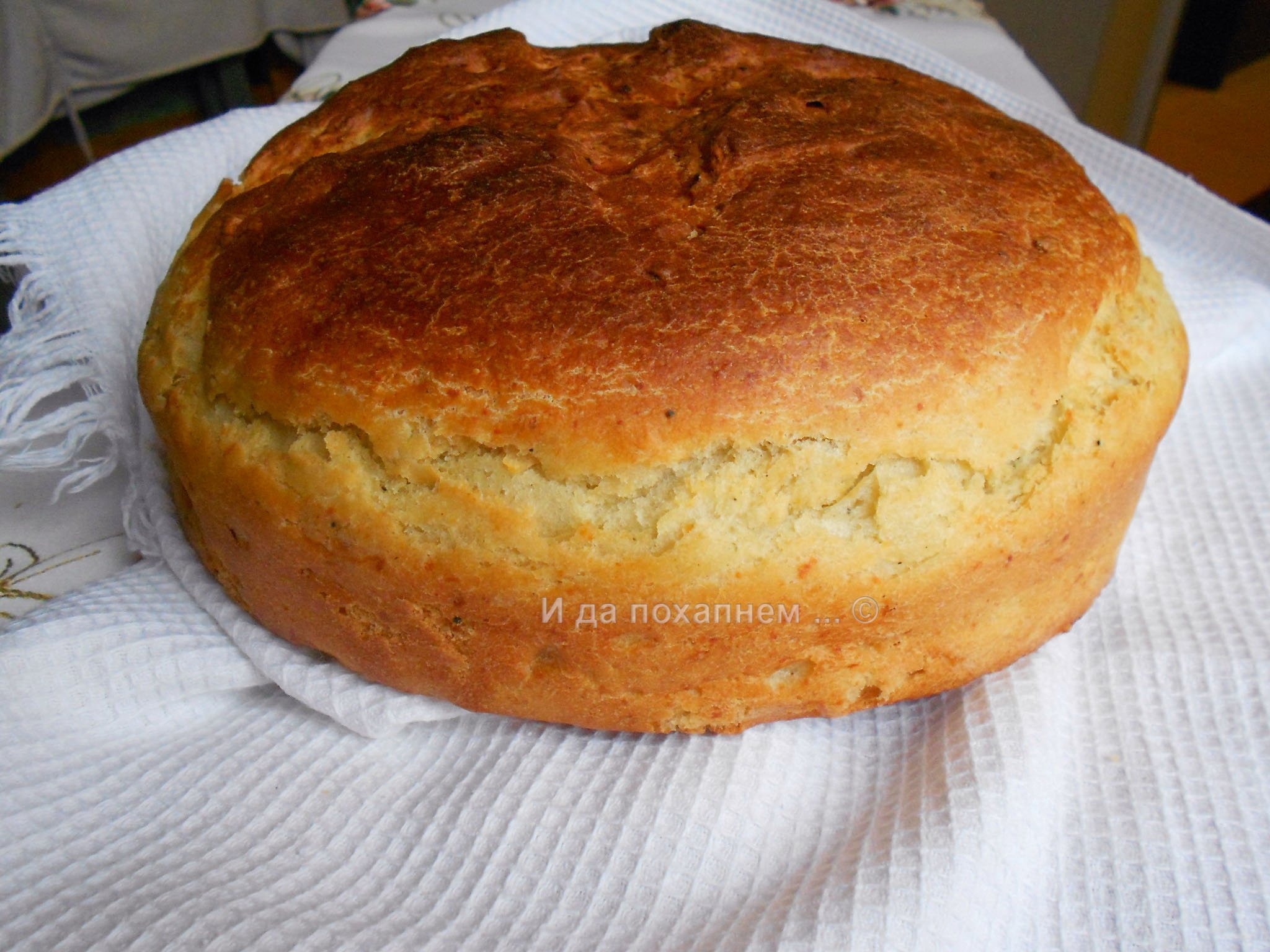Смесете млякото и водата и леко загрейте. Водата да е топла, а не гореща. Смесете картофите и чесъна с млякото и водата. Сложете на дъното на хлебопекарната. Поръсете със захарта. Пресейте брашното. Прибавете 2/3 от него в хлебопекарната, поръсете със самардалата и черния пипер и добавете останалата част брашно. Накрая поръсете върху брашното маята. Настройте хлебопекарната на програма "Тесто". Наблюдавайте тестото докато машината го меси. Може да се наложи да добавите течност или брашно. Когато програмата приключи извадете тестото от машината, омесете и оформете на топка. Поставете в подходяща тавичка и оставете да втаса втори път за около 20-25 мин. Намажете със смес от олио и прясно мляко. Печете в загряла на 180 градуса фурна до готовност.