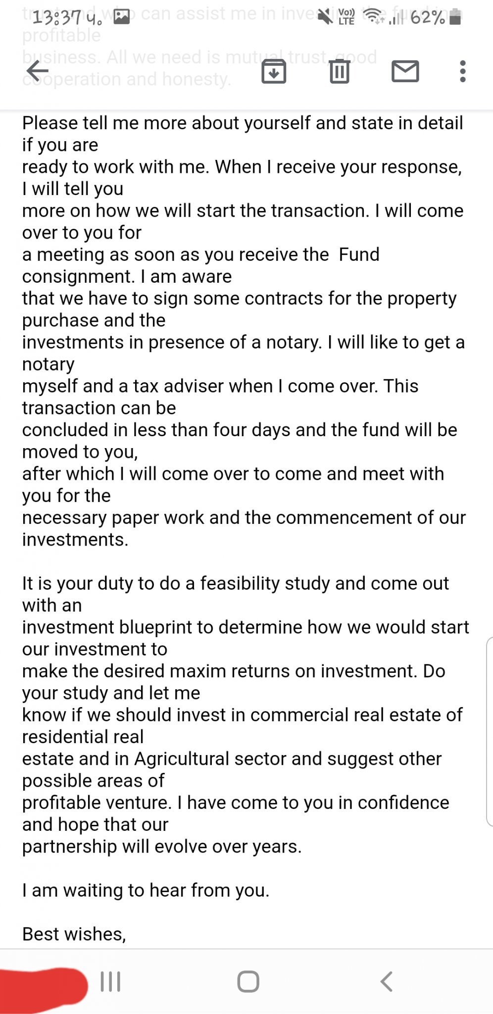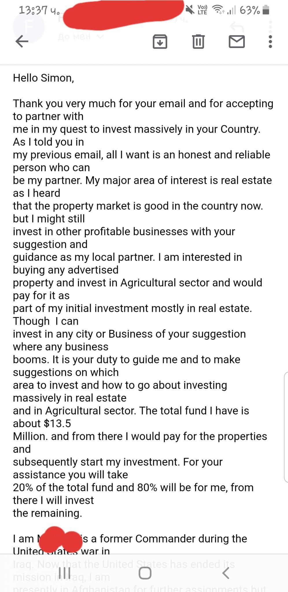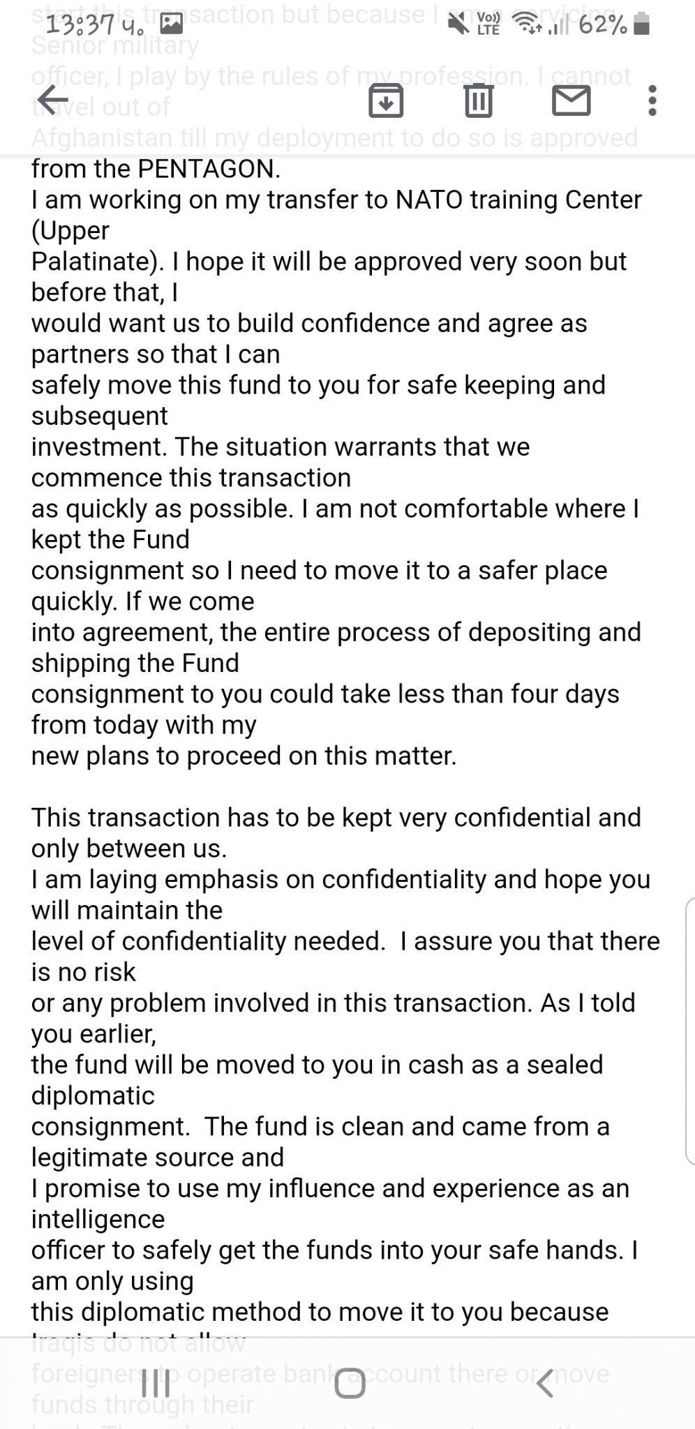 Няма нужда да пускаш цялото писмо в няколко поредни поста. Това е стара стандартна измама, американски генерал в Афганистан ще ти подари 3 сандъка със злато, ако му ги освободиш от митницата за няколко хиляди лева. Или ще ти преведе много пари, само че трябва да му платиш билета и т.н... Беше популярно през 90-те, сега пак изплува.