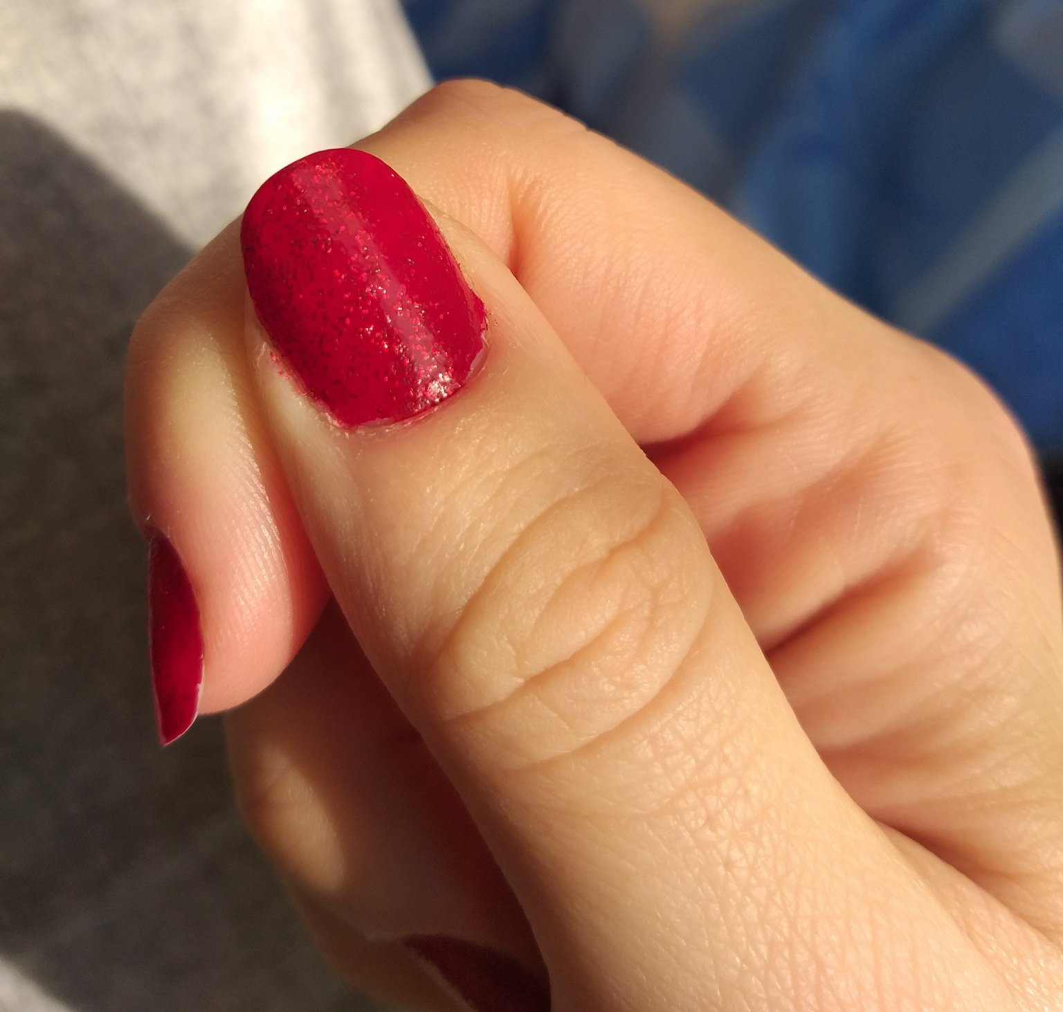 Между другото, съвсем добронамерен съвет, може да ползваш плоска четка за грим, за да оформиш чист овал. Аз ужасно много се цапам с червени лакове, независимо от вида, марката или текстурата. Някакъв кошмар е и винаги чистя след това.