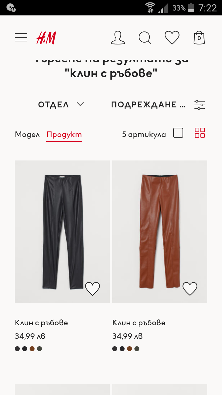И моето Гоше дойде и ми донесе този супер еластичен панталон/клин https://www2.hm.com/bg_bg/productpage.0796210010.html  40р-р УК12 мислех, че ще е по дълъг, ми пак към като рибар( вътрешната дължина е 68см.). И кройката нещо не е моята от пред ми е дълбок отзад като клекна или седна ми се оголва кръста почти до д-то, може и моята структора да е виновна. Ще го полисля защото ми харесва шарката.
