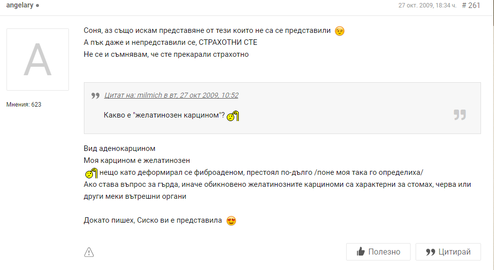 Желатинозен = муцинозен. Муцинозен е па-разпространеното наименование, мамка му. Вътре има нещо като желе, не е твърд. Важно е сега какви ще бъдат другите му характеристики. Моя беше такъв. И на гърда ли го има това говедо бе? Тинти, дано е възможно най-малкия дявол.