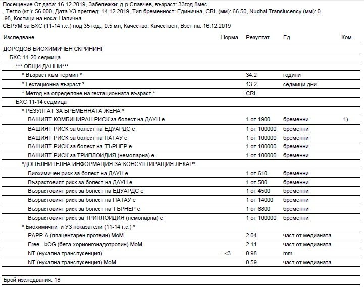Kaylinnn, браво за резултатите от БХС. Аз се бях настроила за часа при Чавеева, че ако не е тя ще се караме. Тази практика е лоша и трябва да си отстояваме правата. Миналата година тя хвана малформацията на плода и нямаше как да допусна някой друг да ме гледа. Сега пак запазих за ФМ час при нея. Много е мила, обяснява подробно. Заслужава си.