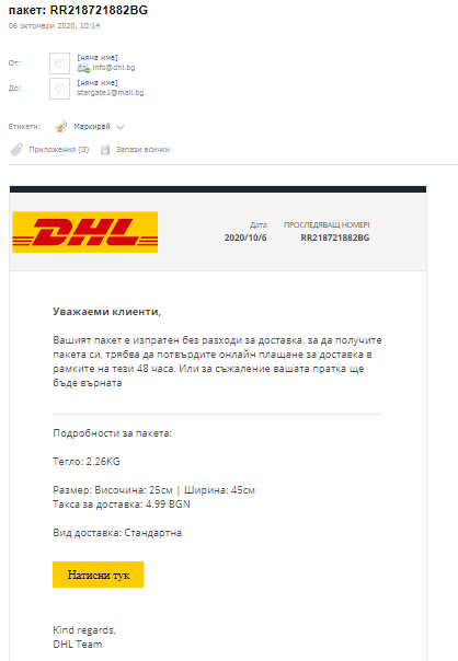 Фишинг мейл е. Ако беше истински мейл, щеше да бъде споменато твоето име - пращали са ми мейли от DHL, но винаги започват със "Здравейте ....." /точното ми име от съответната поръчка/. Включват и име на онлайн магазина, от който е поръчано, номер на товарителница и точен адрес за доставка.