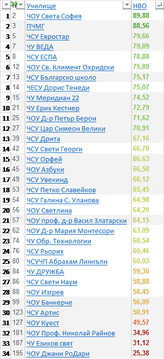 Във връзка с последните дискусии кой е по- по- най ви извадих един прост сорт от ОНАЗИ таблица. Ако ви е интересно ще ви постна по години нещата. Само кажете, за да не спамя излишно. Махнала съм две -три училища, които нямат деца последните повече от една година. Евростар присъства. Ако погледнете нещата по години и отчетете някои изключения с по двама ученика има доста интересни неща. Които като извод се различават от първото впечатление от долната таблица. Това е общия среден рейтинг на Алек Мат. Който отчита чисто средно, но не е претеглено нито през броя явили се, нито отчита тенденции разбира се. Първата колона е по класация само на ЧУ в рейтинга, а втората по класация заедно с ДУ в рейтинга.