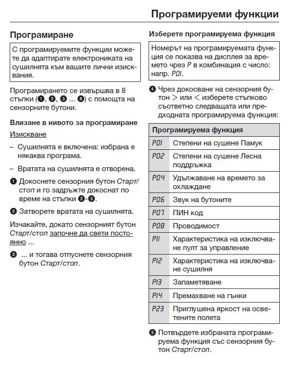 Лунна пътека, твоят тъч програматор е различен от моя, но ако успееш да изключиш фабричните настройки на степен на сушене, за да зададеш твоя избор моля те да споделиш как. При мен в упътването пише, че става с едновременно натискане на два бутона, но не ми се получава. На памук и синтетика мога да избирам от 4 степени, но те са фабрично зададени и се избират само с единия от тези два бутона. Не знам защо не ми се получава избора на степен на сушене на другите програми. Вероятно съм си блокирала сама тези настройки още в началото, а и преди година като я взеха втория път в сервиза за ремонт и профилактика техника казал на мъжа ми, че й направил някакви настройки, но той пък не разбрал какви и как. Може би има начин да се изключат всички настройки до момента и да се започне все едно е сега купена, но в моето упътване не намирам къде пише как се изчиства всичко зададено до момента. Ще съм ти много благодарна да споделиш не само дали си се справила с настройките, но и как. Може би на лични за да не е спам по темата.