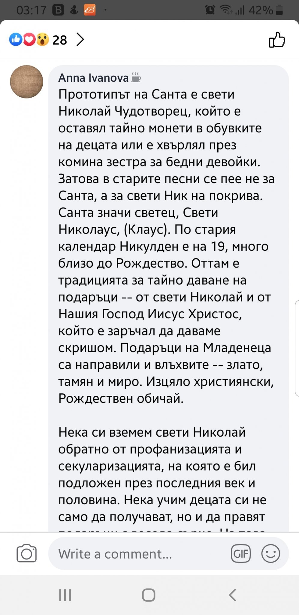 Беше ми интересно да изчета написаното. През годините и аз съм се ровила и чела доста теории и хипотези. Общият знаменател на всичките е желанието да направиш добро и да зарадваш някой. И аз лично не виждам нищо лошо хората да си измислят, обогатяват и разпространяват истории, които подтикват към добрина. Щото можеше и да се изопачи историята към доста по-ненормални традиции, за които слушаме по новините от време на време.....