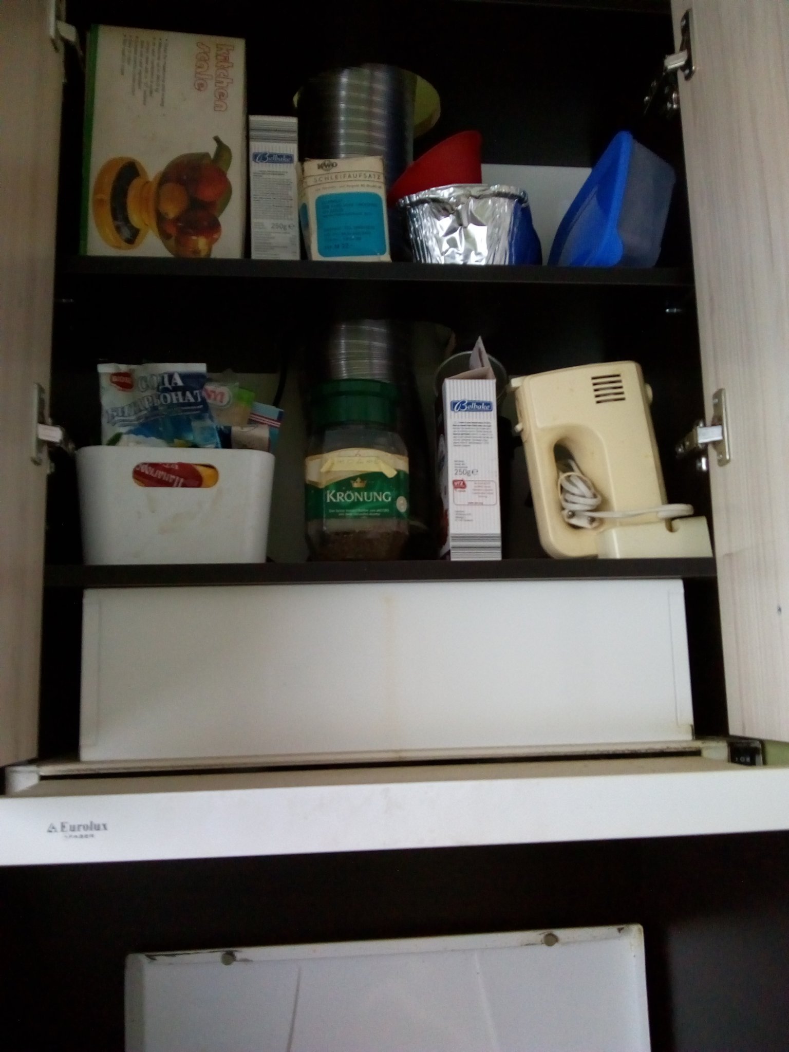 Също имаме един шкаф, който не се сещам как да използваме - този над абсорбатора, който е вграден. Има 2 рафта, като абсорбатора минава по средата и на двата. Какво бих могла да държа в този шкаф изобщо ?