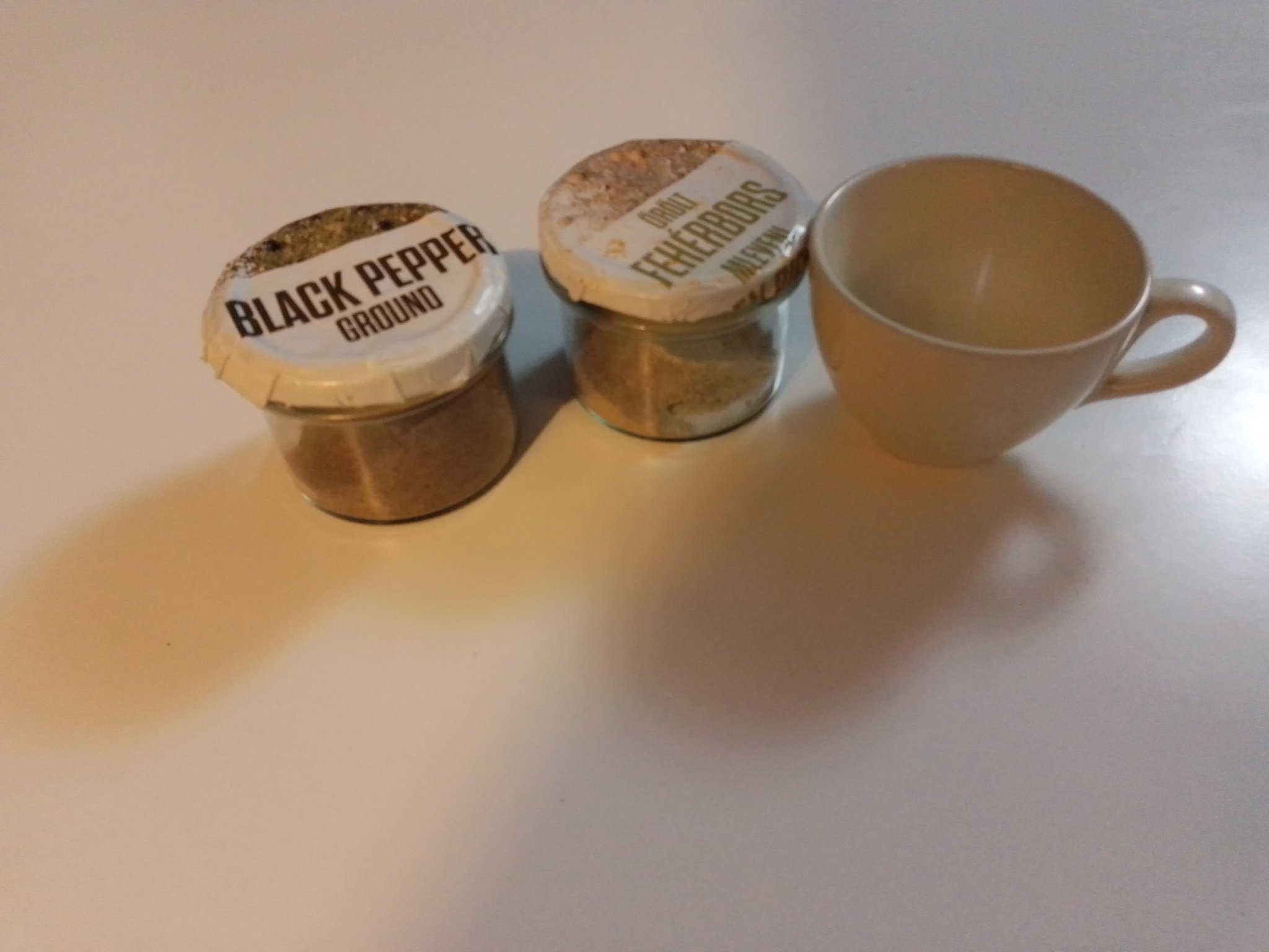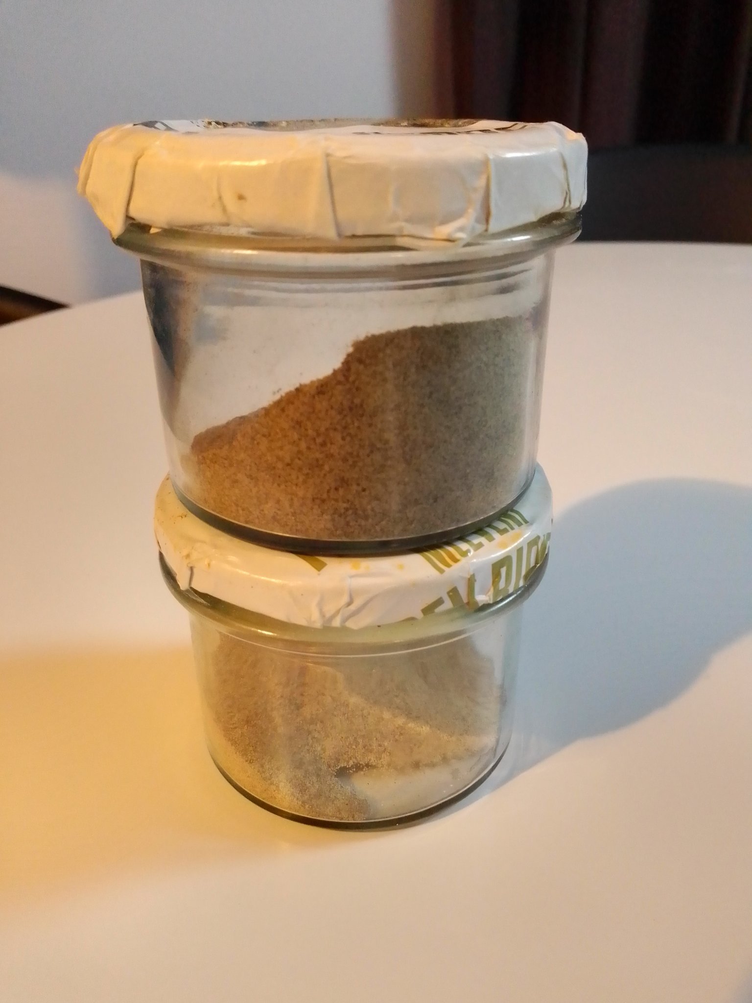 По въпроса с бурканчетата, зависи от подправките... За червен пипер, вегета.... може да са 200-250 гр, но за някои подоравки това са твърде големи количества. Пускам снимка на бурканчета в които държа черен пипер, не са купени за тази цел, както се казва "рециклирани са ". На капачките съм сложила опаковките и така знам какво има във всяко бурканче. Не заемат много място, мигат да стоят и едно върху друго.