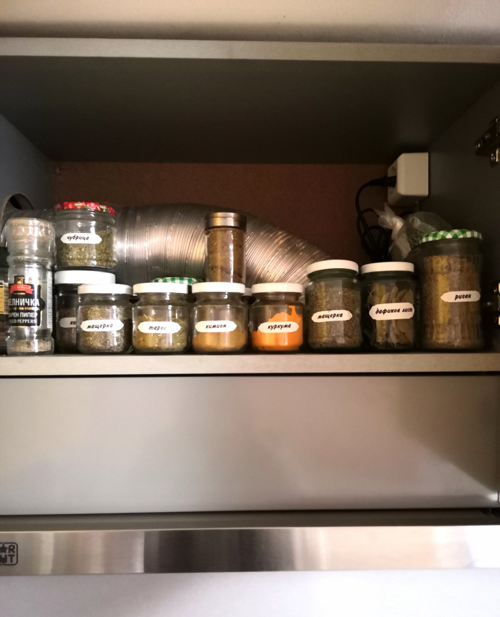 Ето и моите подправки. В шкафа над аспиратора. Обикновени бурканчета.