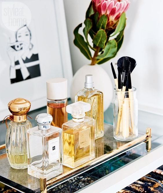 Затворени в някакъв тип шкафче или чекмедже си е най-добре за парфюмите и без това, не само за да не събират прах. Това с подноса може да изглежда добре ама друго предимство не виждам.
