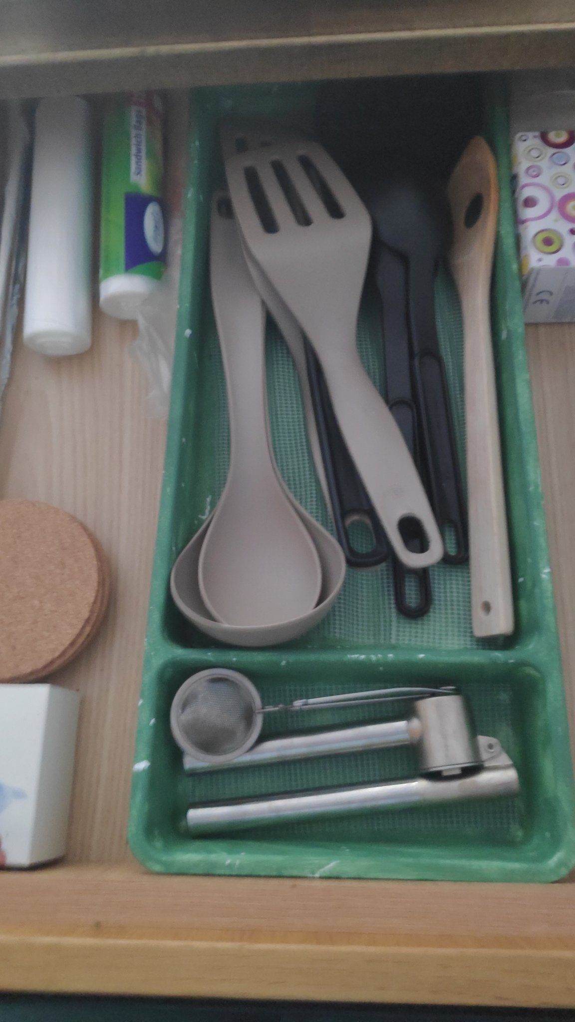 И на мен не ми е удобно да са наредени в чекмедже, особено тези които ползвам най-често. До момента най-добре ми е с две еднакви керамични халби, в които са сложени като във ваза черпаци, дървени  и решетъчни лъжици, шпатули и подобни. Халбите си ги харесвам много и са ми и за декорация, та не ме дразнят. В чекмедже съм оставила само неща които ми трябват рядко, то за тях все тая дали са подредени или не. Нож за пица, лъжица да сладолед и подобни, те не ми трябва да са ми точно пред очите като не посягам към тях по цели месеци.