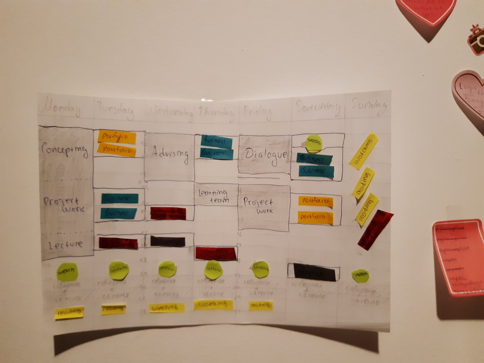 *на отделни цветни листчета си написвам нещата, които искам да правя през следващата седмица/месец (например: жълто - четене, синьо - фитнес, зелено -  готвене, сиво - чистене, розово - излизане с приятели )и после ги залепям на празните полета в седмицата ми. Това ми помага, защото така имам цялостна картина на седмицата и знам че съм включила всичко необходимо. За мен е по-лесно, когато имам фиксирано време за работа и за почивка, защото ако не си определям конкретно време, през което да си свърша нещата, в повечето случай ме домързява и отлагам за друг път, и така докато не дойде наистина крайният срок, когато вече съм стресирана.