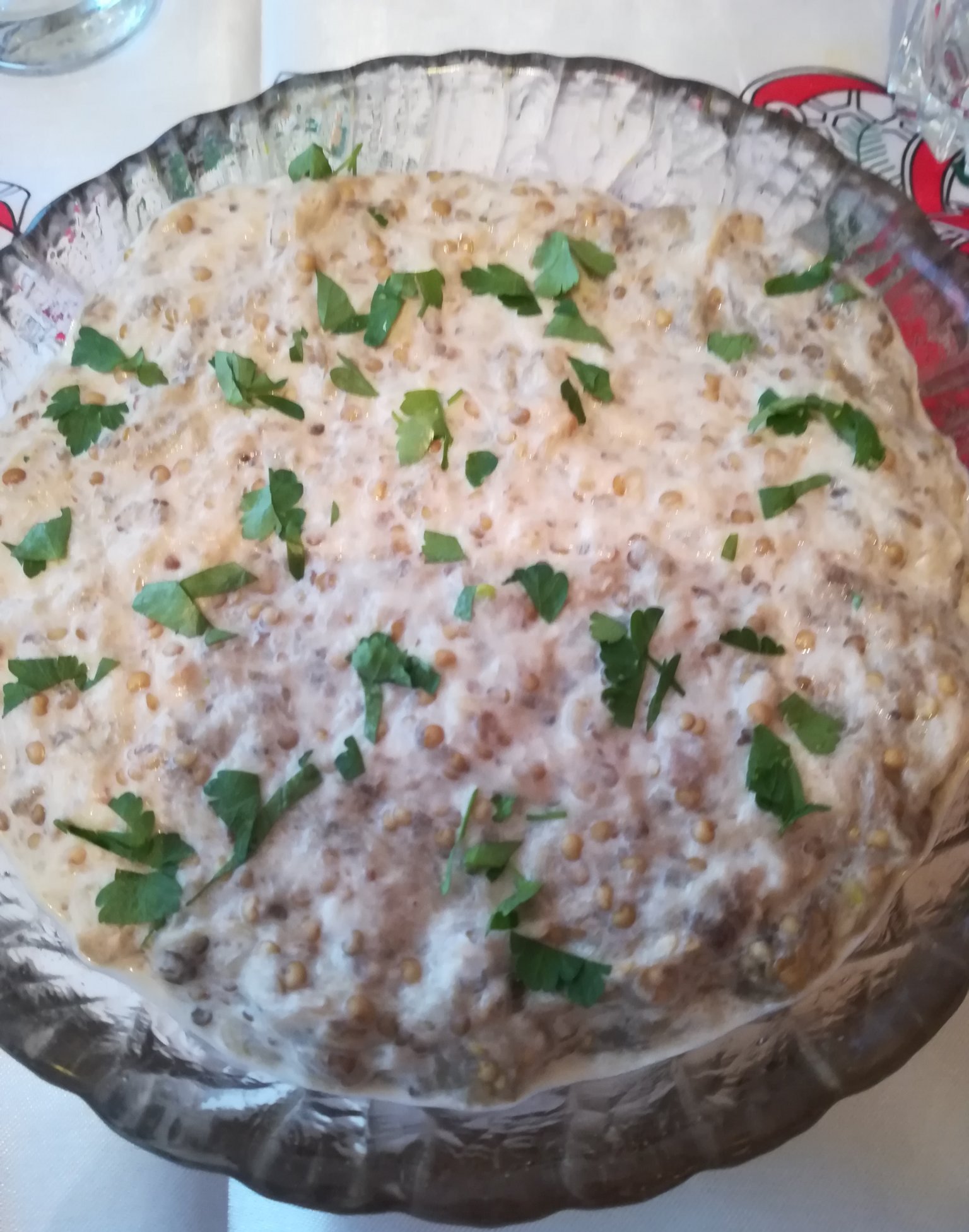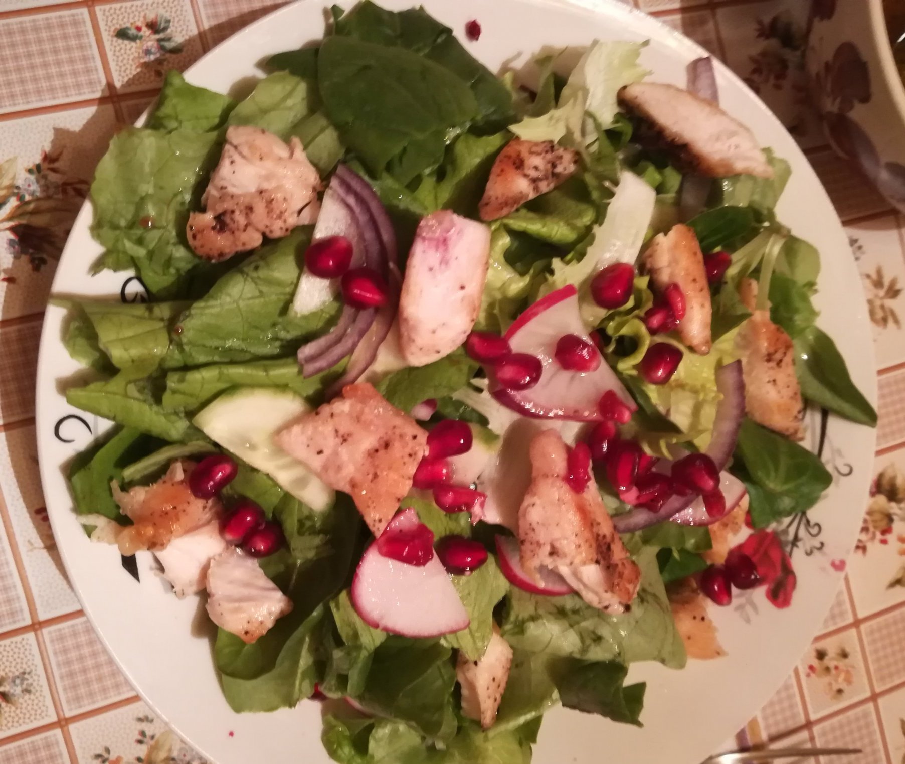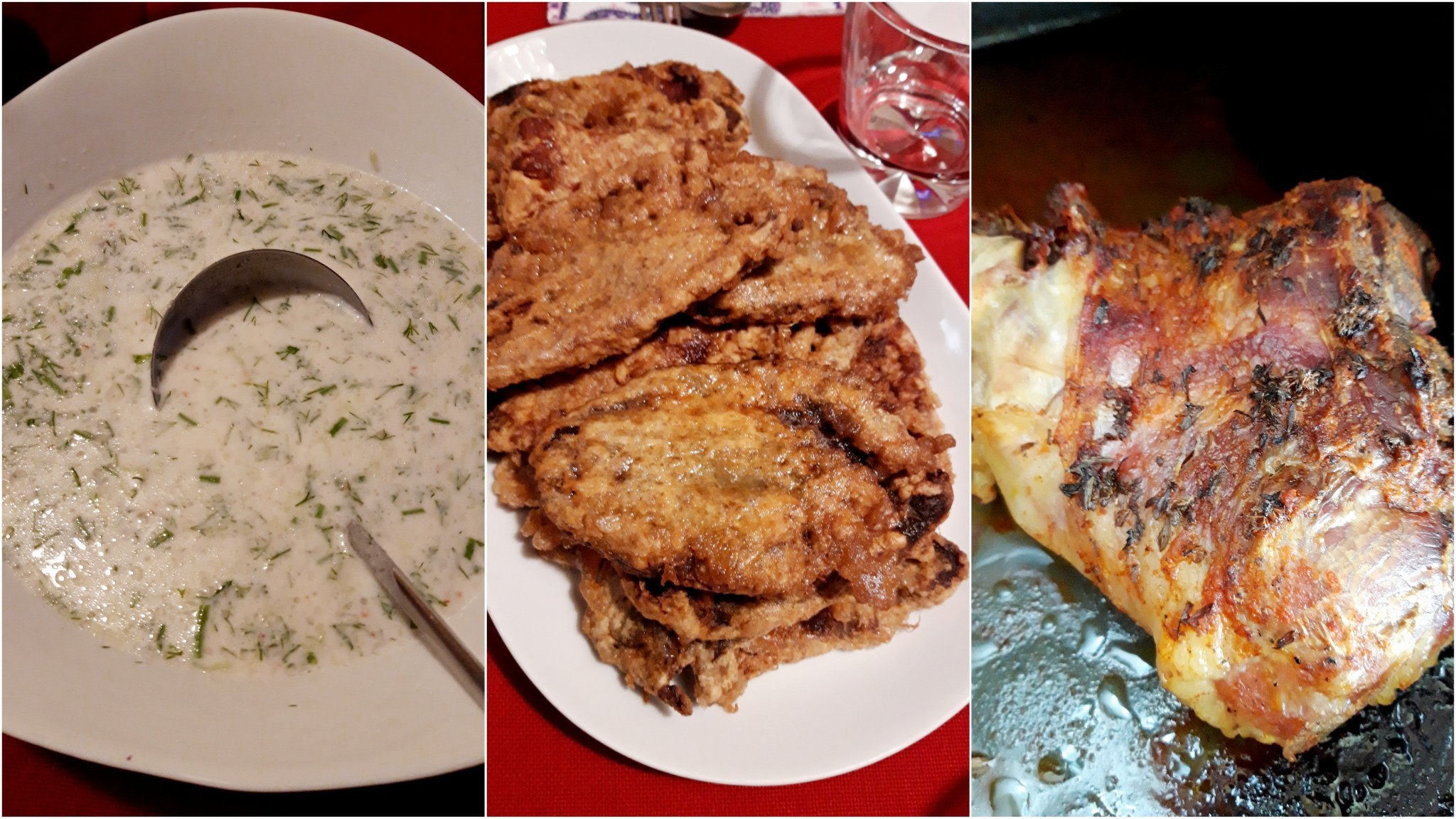Таратор с малко репички и краставици и много копър; панираните чушки на Люска; печено ярешко бутче