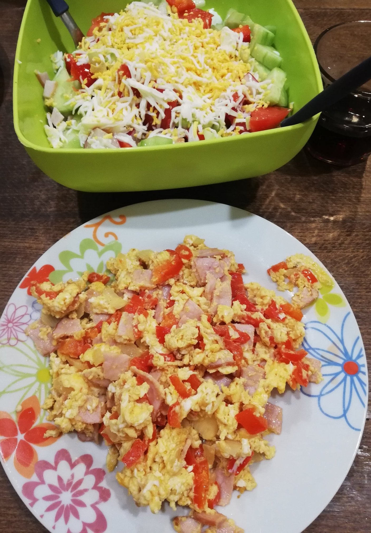 Салата домати, краставици, репички, колбас, чушка, яйце и буркани яйца