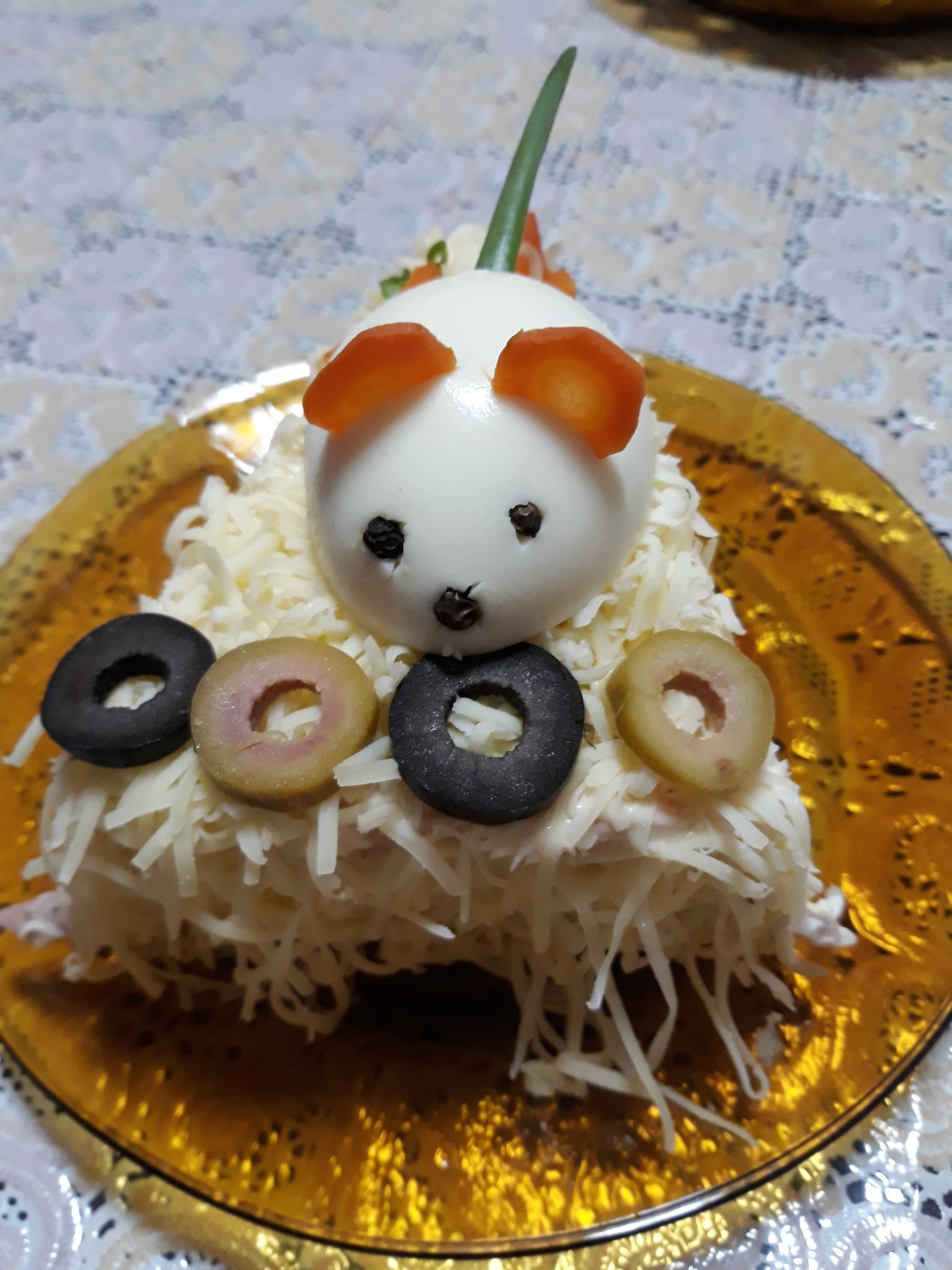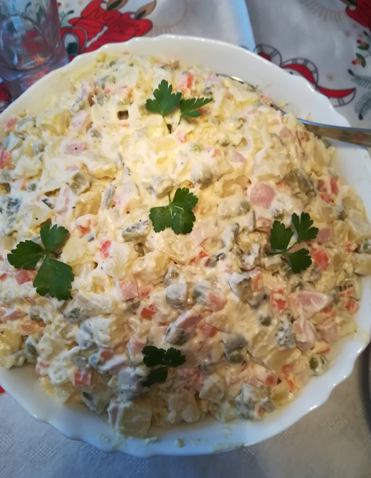 Свински бут в понзу сос, бяло вино, пикантни подправки; Салата тип Оливие в персийски стил с пилешко, картофи, грах, краставички, яйца