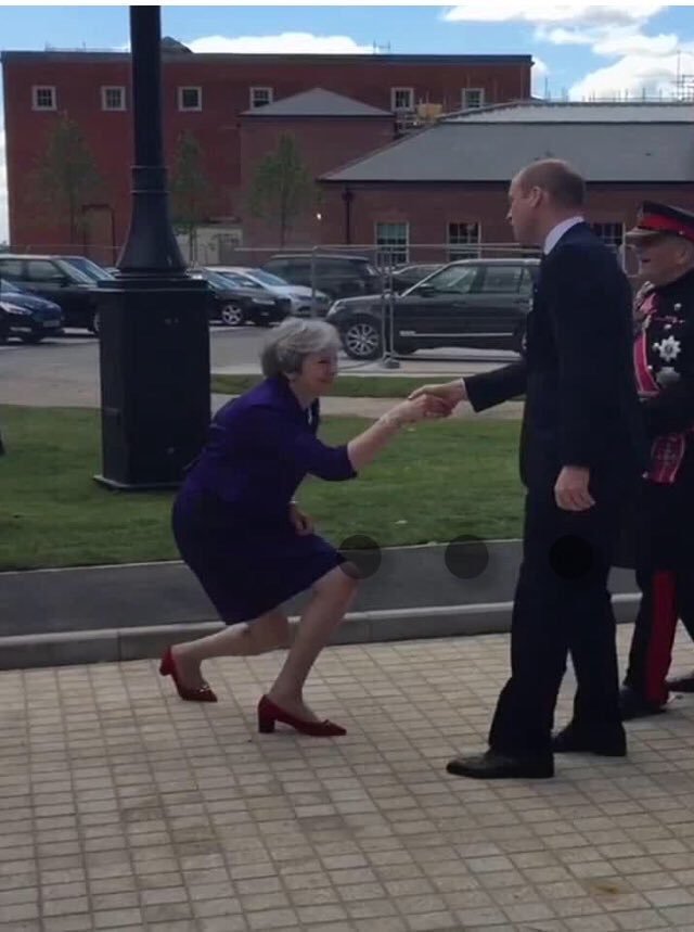 Любим ми е реверанса на Тереза Мей всеки пък ме пука от смях иначе имам чувството че има няколко начина за правене на реверанс гледам по-възрастното поколение го правят по друг по-смешен начин