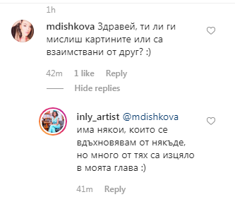 А едно момиче я попита черпи ли вдъхновявение за картините си от други автори, защото е видяла същата в "Списание 9 месеца" и Коца написа това. Laughing