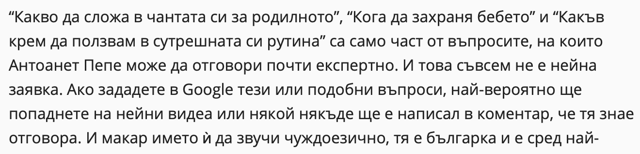 За сметка на това бг-мама все си е там. Simple Smile Да, сигурно Пепе ще се появи някъде нататък, в никакъв случай не отричам популярността и, успява да влезе в устата и клавиатурите на хората, но не е почти експерт по никоя от изброените теми. Тя е истински експерт в това да споделя интимни моменти и после да се сърди, че не и уважават личното пространство. Simple Smile