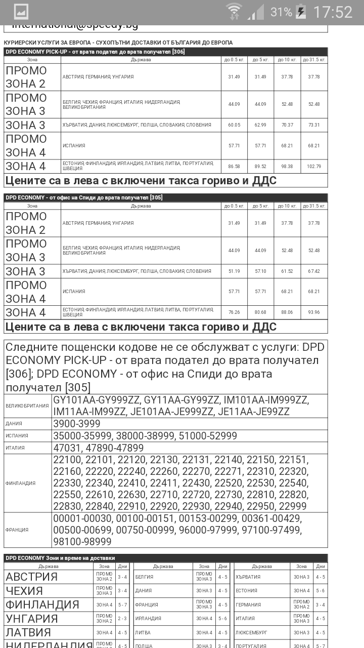 Не мога да намеря таблицата на Спиди за международни пратки кг/цена. Thinking
