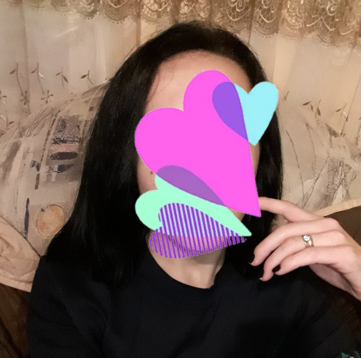 Боядисана е с черна къна, изправям я с преса или я оформим със сешоар,нямам проблем с накъсаните краища все още.