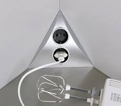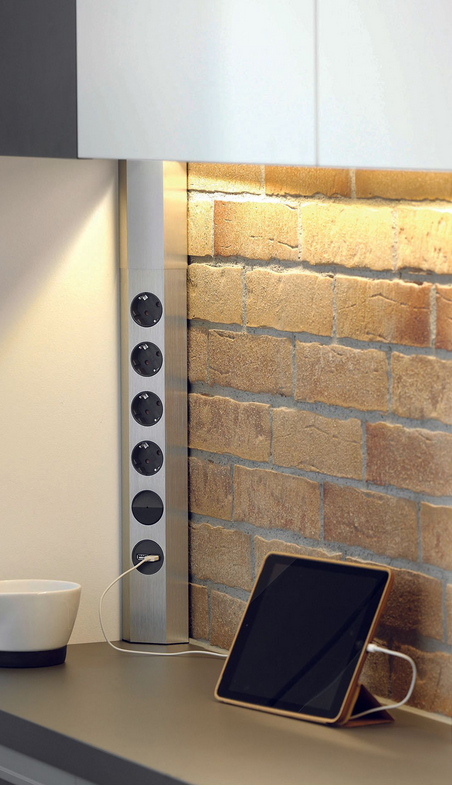 Structure of 4-way corner socket column from Thebo. As a surface-mounted socket, you can ideally use it in the kitchen, counter, office, work table, etc. Solid stainless steel version