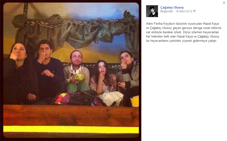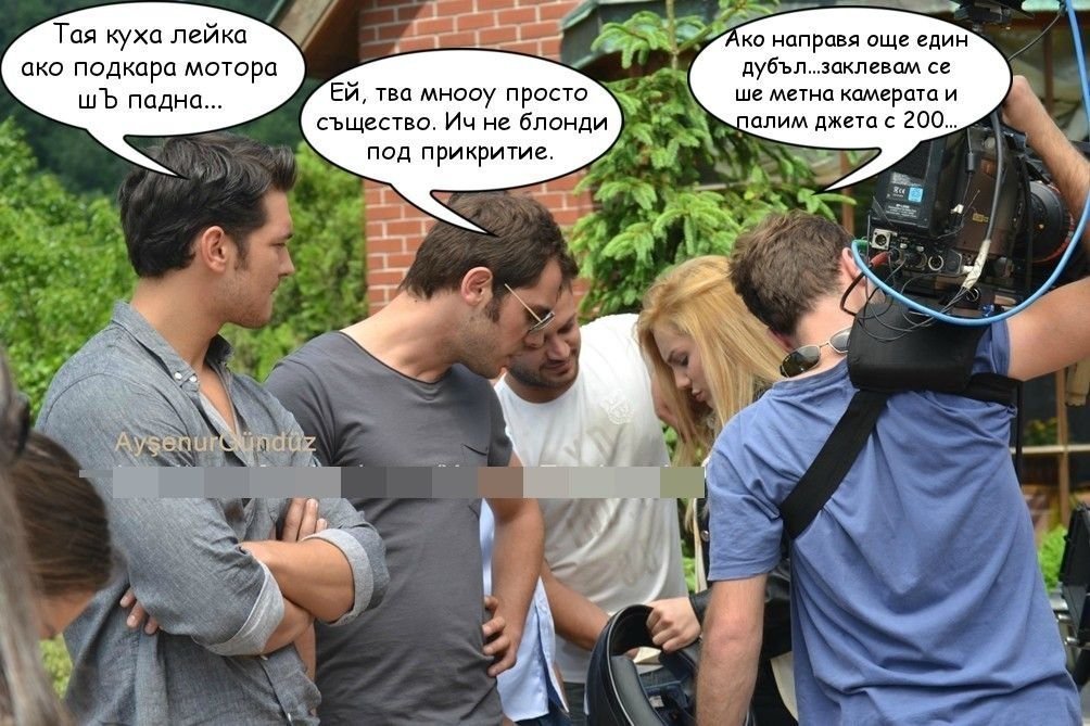 За Ореите, има куп снимки на които като са заедно и си куфеят нещо, сам е казвал че правел всичко с нея, което не можел с приятелката си, отделно нещата които идваха като новинки от сета че и 1-2 откровения на Хазал Joy Много му обичах тази откровеност навремето, нямаше друга такава скица hahaha Но както Профа беше забелязала, на повечето им снимки ги вардят Диренч и Бату, които винаги сядат между двамата hahaha  Има и няколко известни изрязани снимки на които до него се вижда само част от върха на главата на Хазал, едната я  някъде я има назад като комикс hahaha Темата почивка от сет в 62-ра серия, докато се въртят около мотора на Еджето, а около тях оператора, Юсуф и Ямур Танръсевсин. Изрязаната до Ча е само Хазал ooooh!