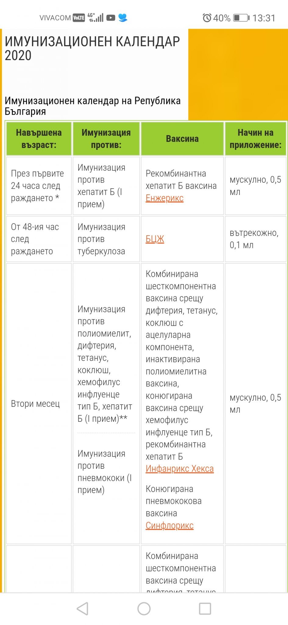 Не Марти на 2 месец започват, тогава трябва да идем 2 ще поставят... И две седмици след това казаха да идем за първата доза капки за ротавируса. Мисля че има промяна в имунизационния календар от 2020,нешо такова споменах докторите, но нашите са родени 2019г и ще си бъдат по стария. Някой беше постнал в Фб групата имун. Календар за 2020 и там мисля има на 1 месец, но нашите деца си карат по стария, така обясни доктора.