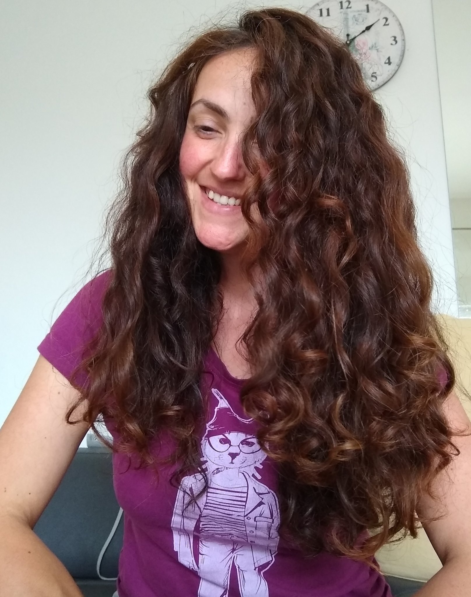 За пореден път се убеждавам (както каза Ванеса), че моята коса с по-малко продукти е много по-добре. Супер хепи съм, не знам от метода ли е или продуктите, но такава коса на главата си скоро не бях виждала. Довечера мога да намеря линк към него, че сега едно две годишно ми се катери по главата.