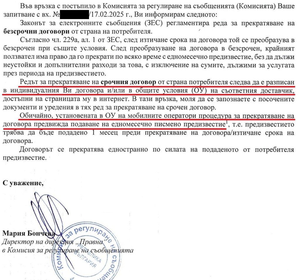 Безсрочен се прекратява с едномесечно предизвестие според ЗЕС(Закон за електронните съобщения). Тук не е имало спор.