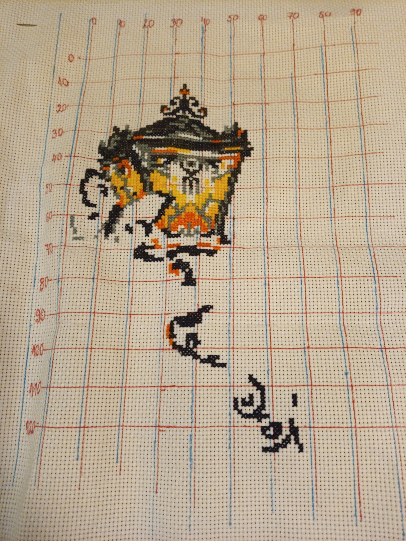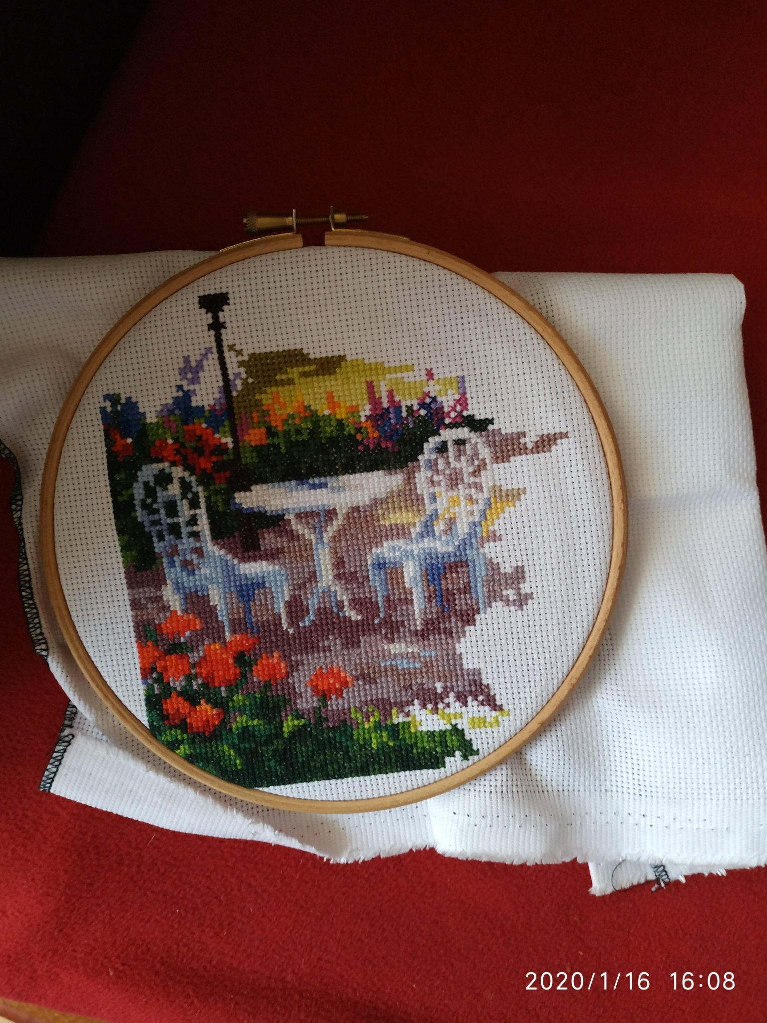 Като стигна фона, гледам да ушия този цвят, който ми обрамчва гоблена, и гледам за накрая да ми остане цвят, който ще е очертан от всякъде, т.е. няма да има броене при него, но и да е доста, а не да е 3-4 бодчета примерно. Така ми е по-лесно, спестявам си доста броене. При пилците, дето шия, се вижда ясно, ето тук