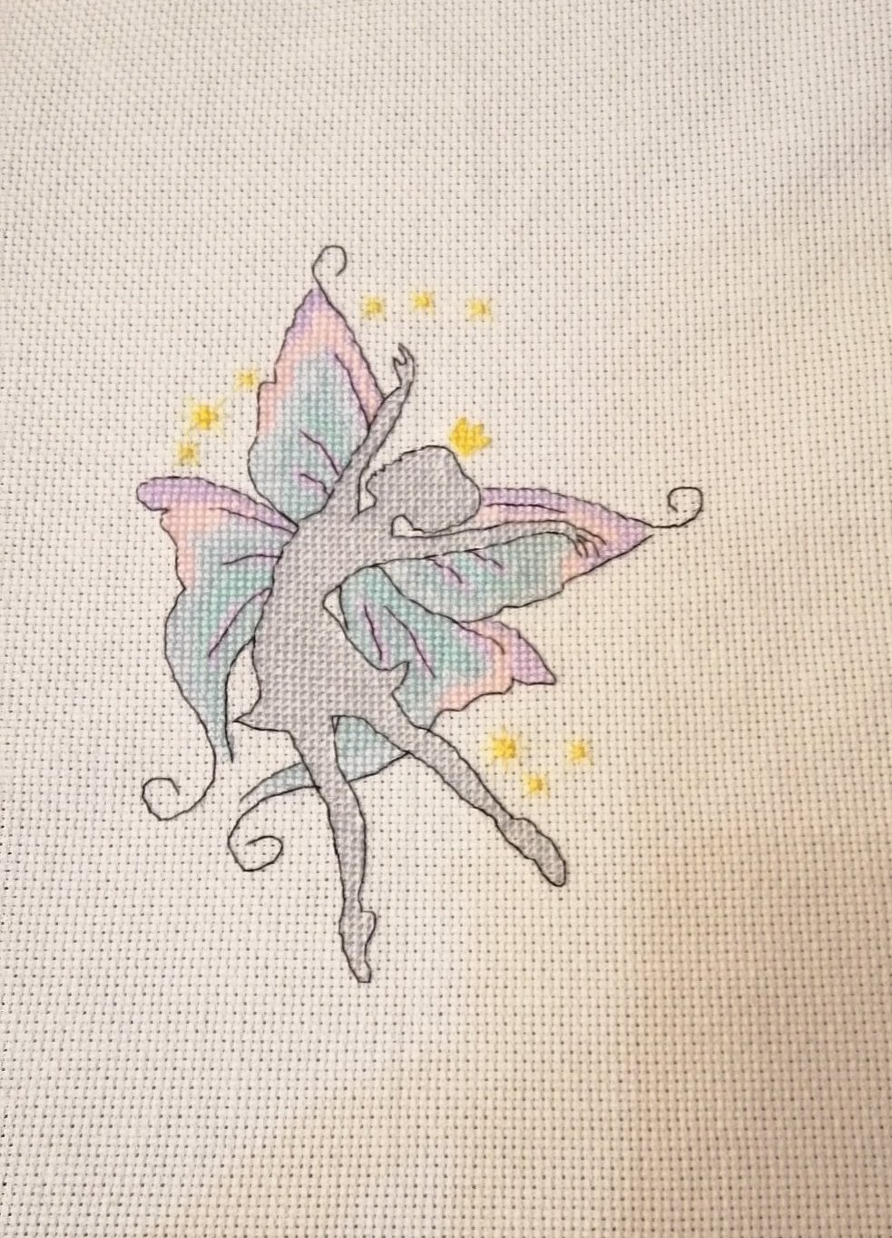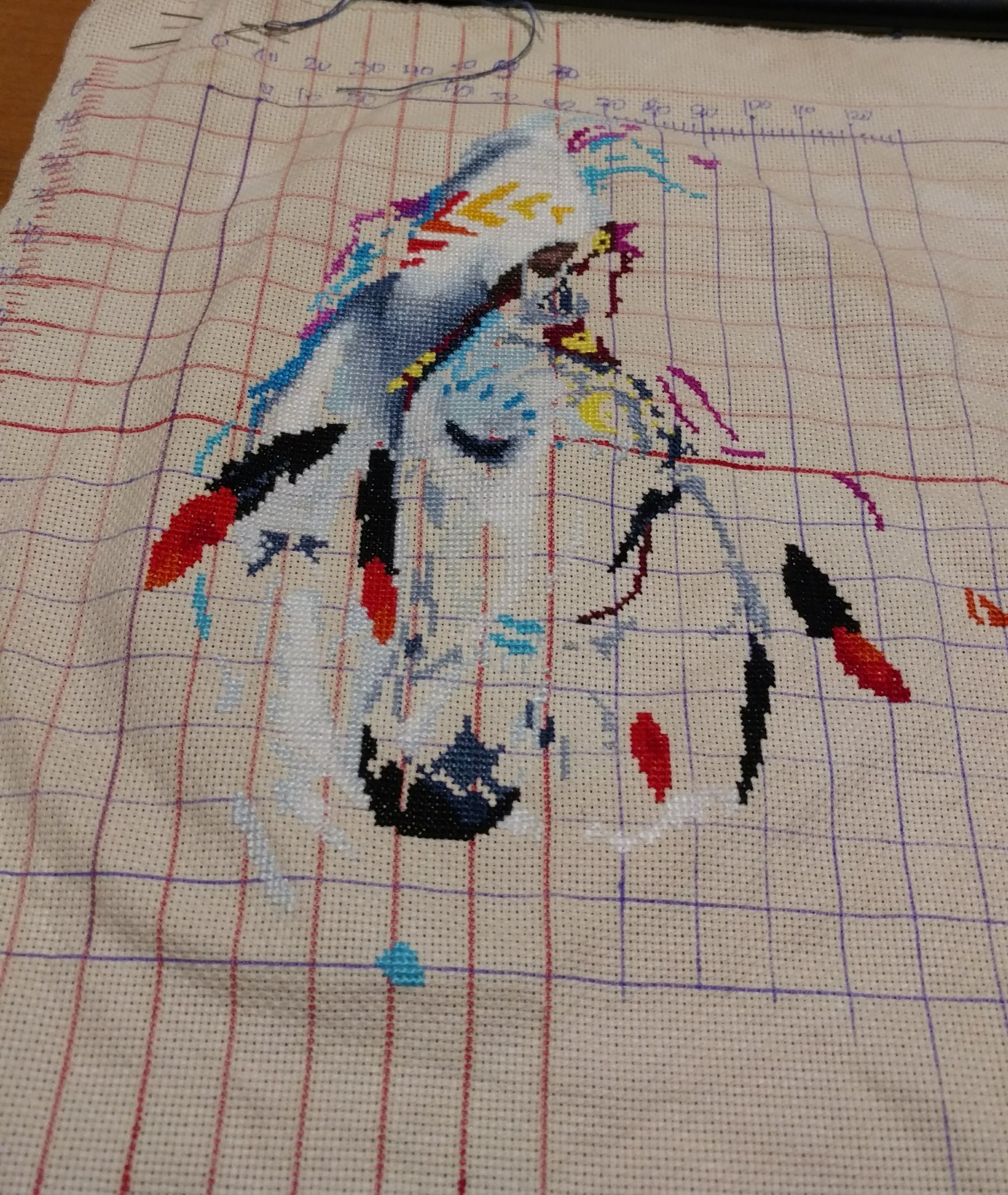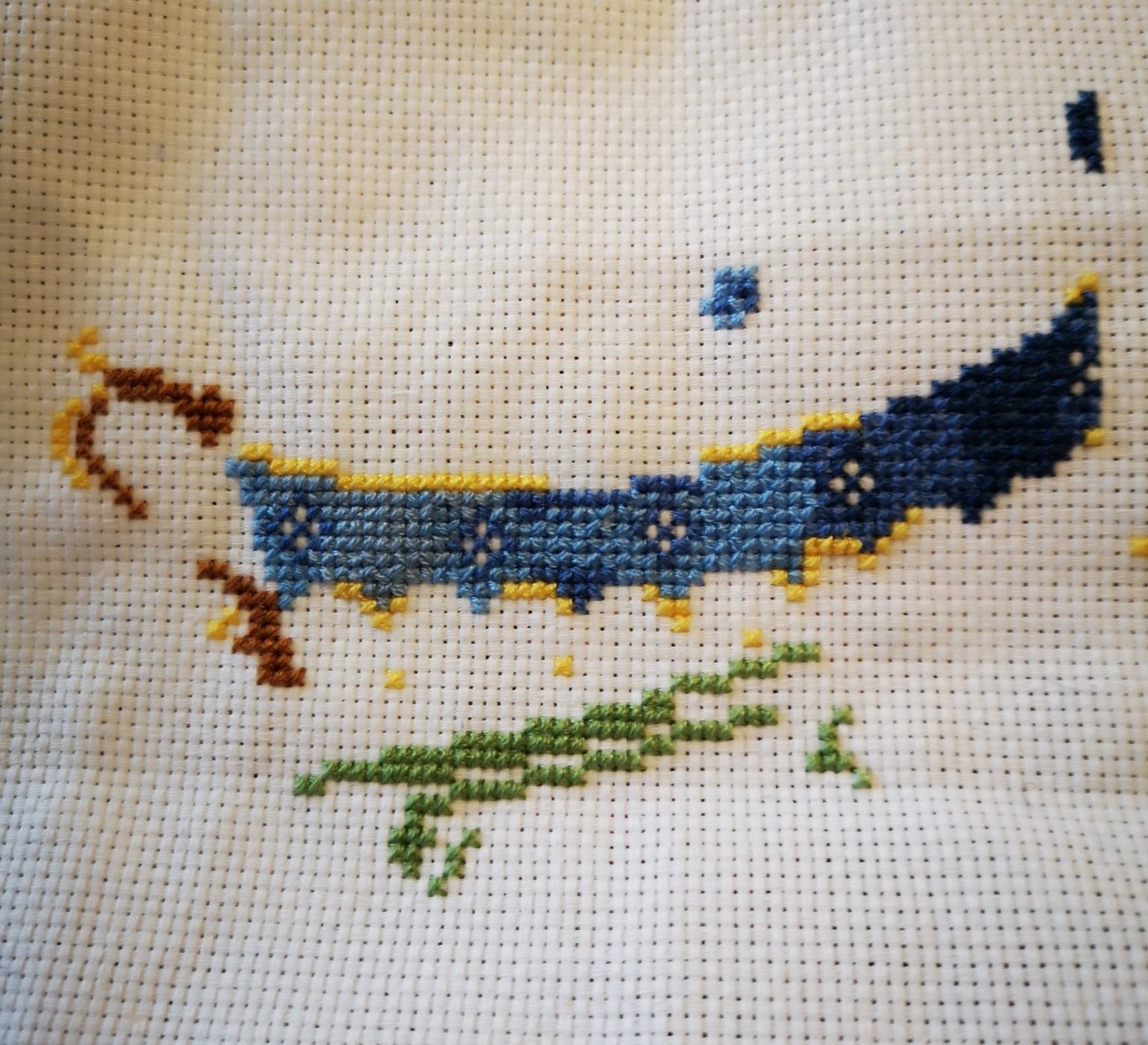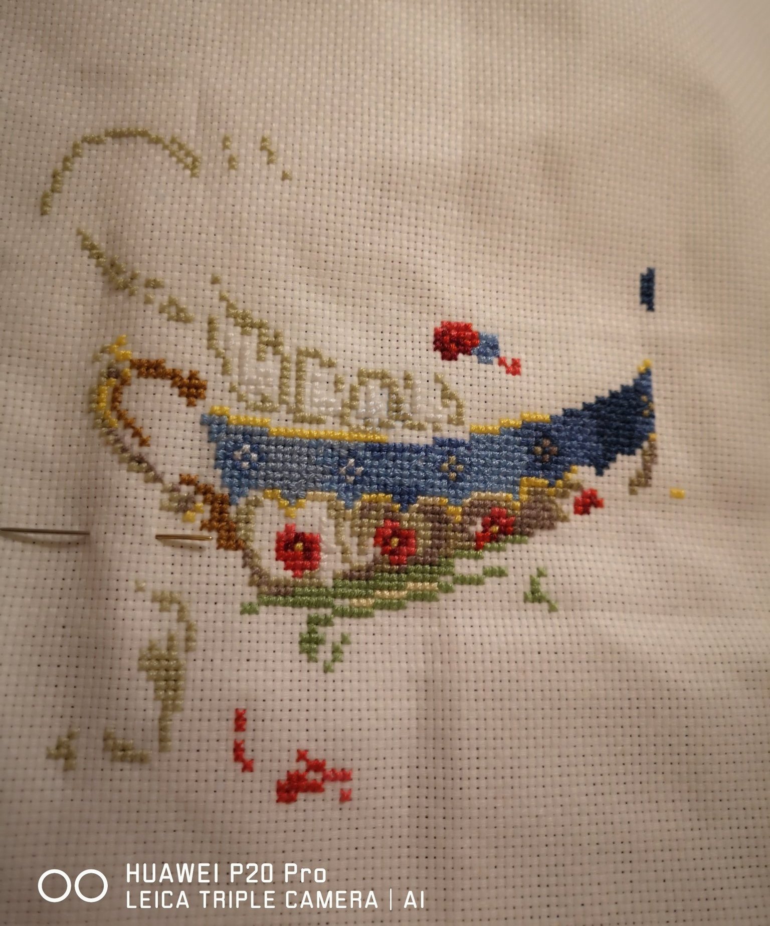 Остават френските възли (за първи път ще правя). Не съм избрала подходяща панама, защото има много половинки бодчета при контура и конеца се завира между конците на панамата. Следващия път ще пробвам с коучинг, че в горната част на крилата е много назъбено. Сега се чудя как да я оформя - за картичка е голяма. Може би на калъфка. Ще питам шивачката дали ще справи.